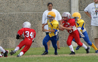 Hayden was recovering from the flu when they went head to head with Cyprus. We started off strong on defense and Hayden was an animal trying to sack the QB. Hayden had some good runs, but got hit in the stomach right before 1/2 time and that slowed him down quite a bit. In the end Cyprus beat the Braves by one touchdown in a bit of a stressful game. Being an 8 year old team and not knowing all the ropes put everyone on edge and I think it spilled over onto the boys. Slightly rattled and very down we headed for home with 2 losses under our belt.